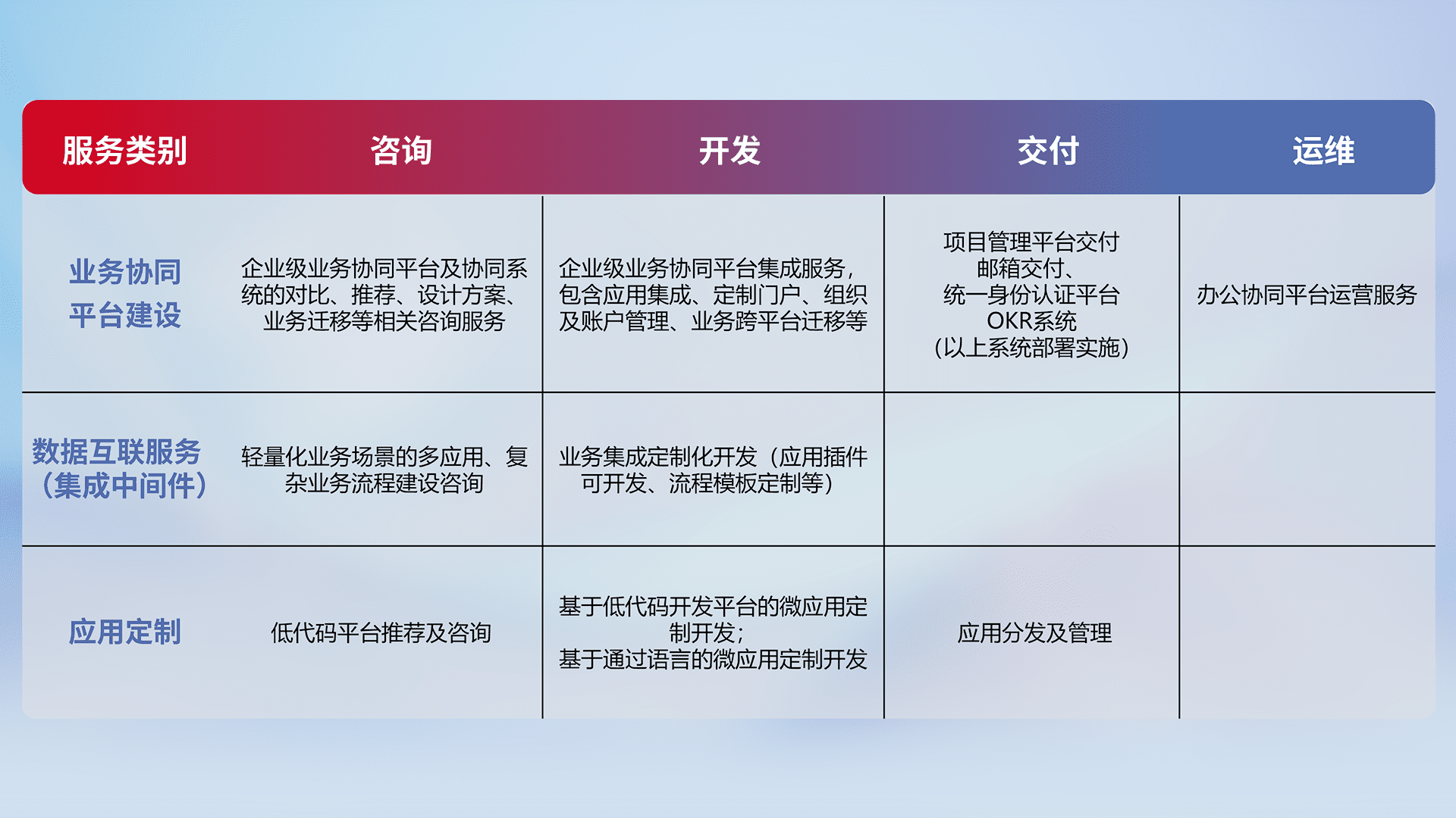 针对钉钉、、企微、、、IDaas等平台级产品提供产品的规划、、、方案、、交付、、、定制化开发等服务,,实现如统一协同办公、、、智能客户服务、、、混合会议管理、、智能数据查询、、、、等业务场景,,,,实现数字化转型。。。