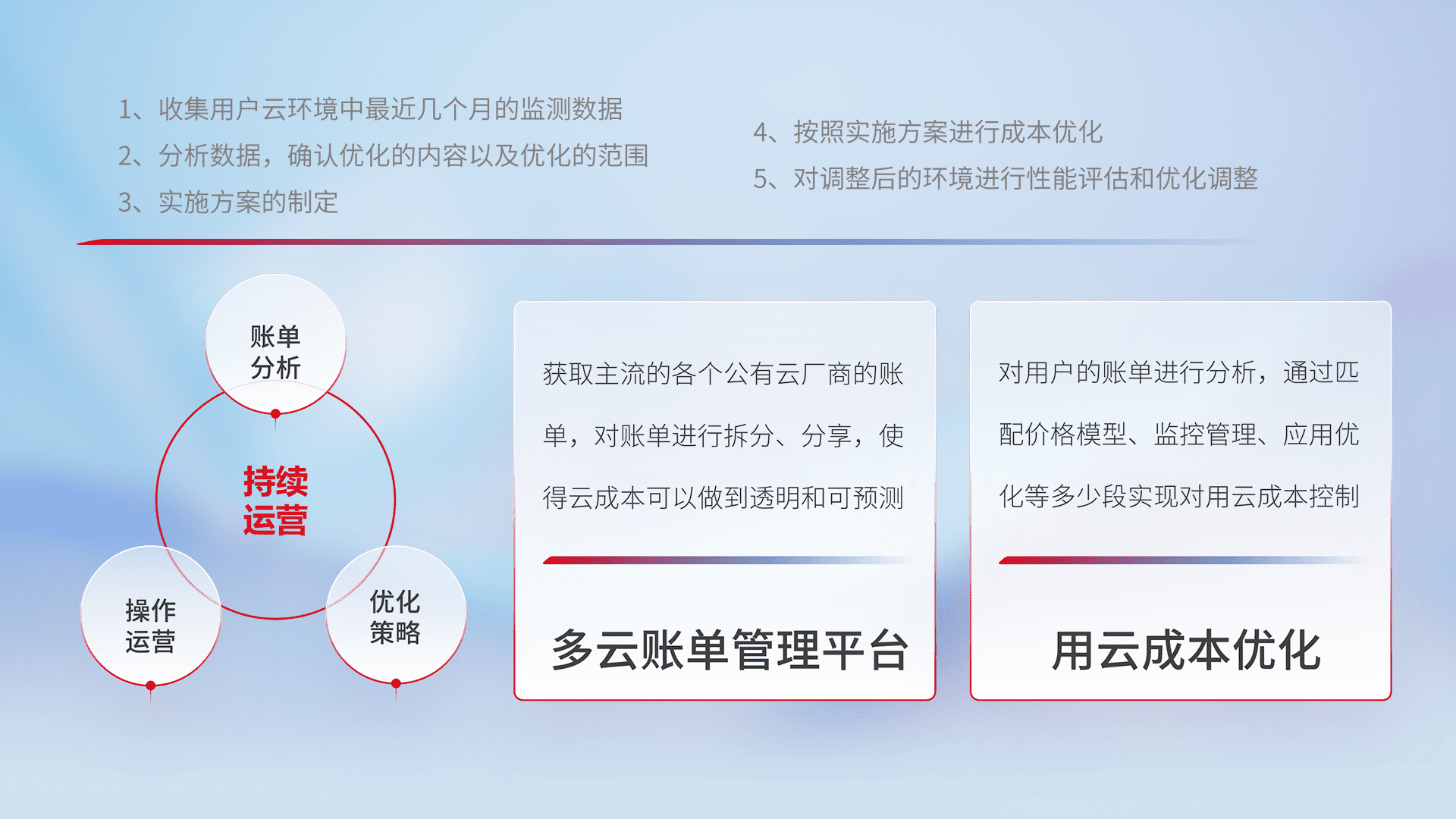 通过灵活运用多种自动化迁移工具,,帮助企业用户实现业务和数据高效 、、、、稳定的上云迁移和云上迁移,,,采用自研多云纳管平台,,,以中立管理模式,,,,解决多组织、、、、多云、、、、多运维厂商的复杂关系的管理,,保证多云平台资源配置的一致性,,,,实时掌控云资源运行数据,,,运用智能化工具分析云资源多云平台的管理服务,,,透明化管理成本支出,,,用云成本可预测、、、、用云费用可优化、、云资源配额有据可依。。。