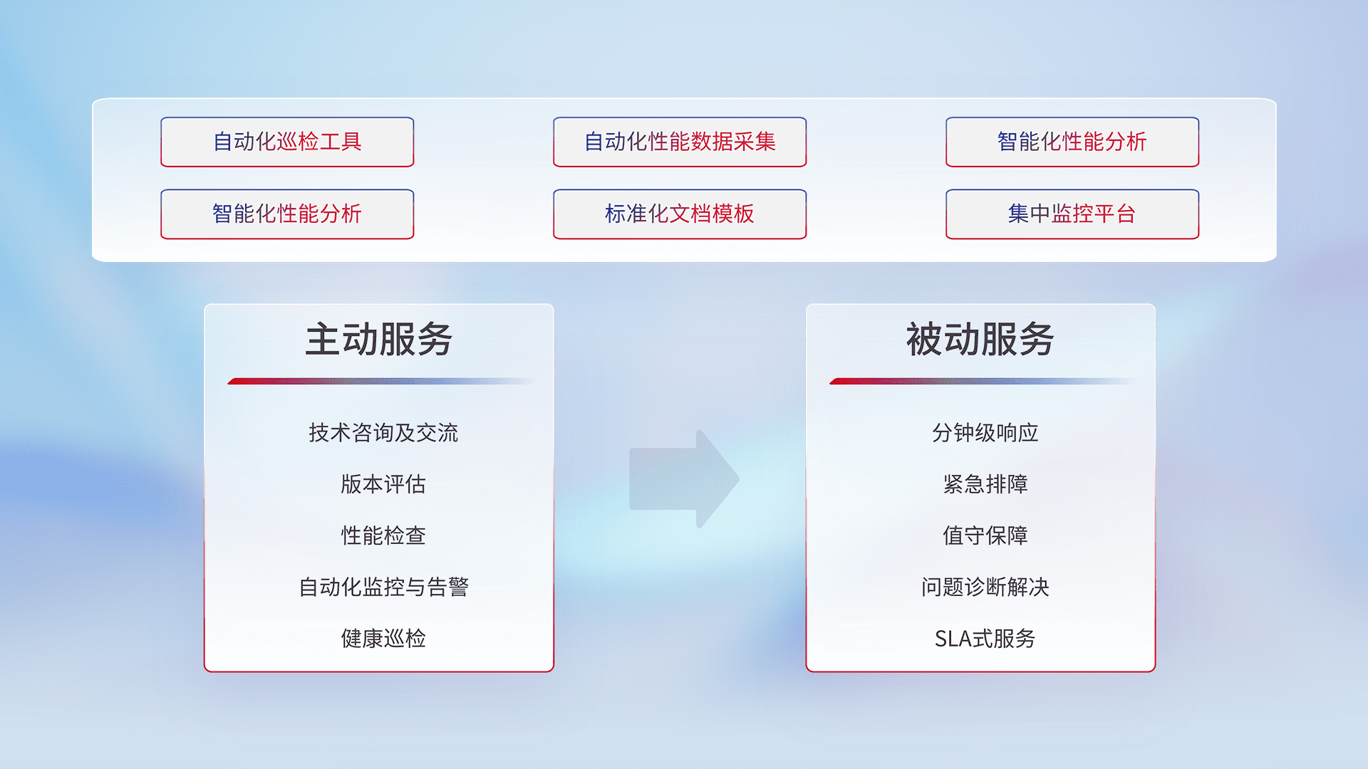 智能化工具和标准化文档,,,保障服务质量,,提供主动服务(包含技术咨询、、版本评估、、、性能检查、、、、自动化监控与告警、、、健康巡检)和被动服务包含(分钟级响应、、、、紧急排障、、、值守保障、、、问题诊断解决、、、SLA服务)。。